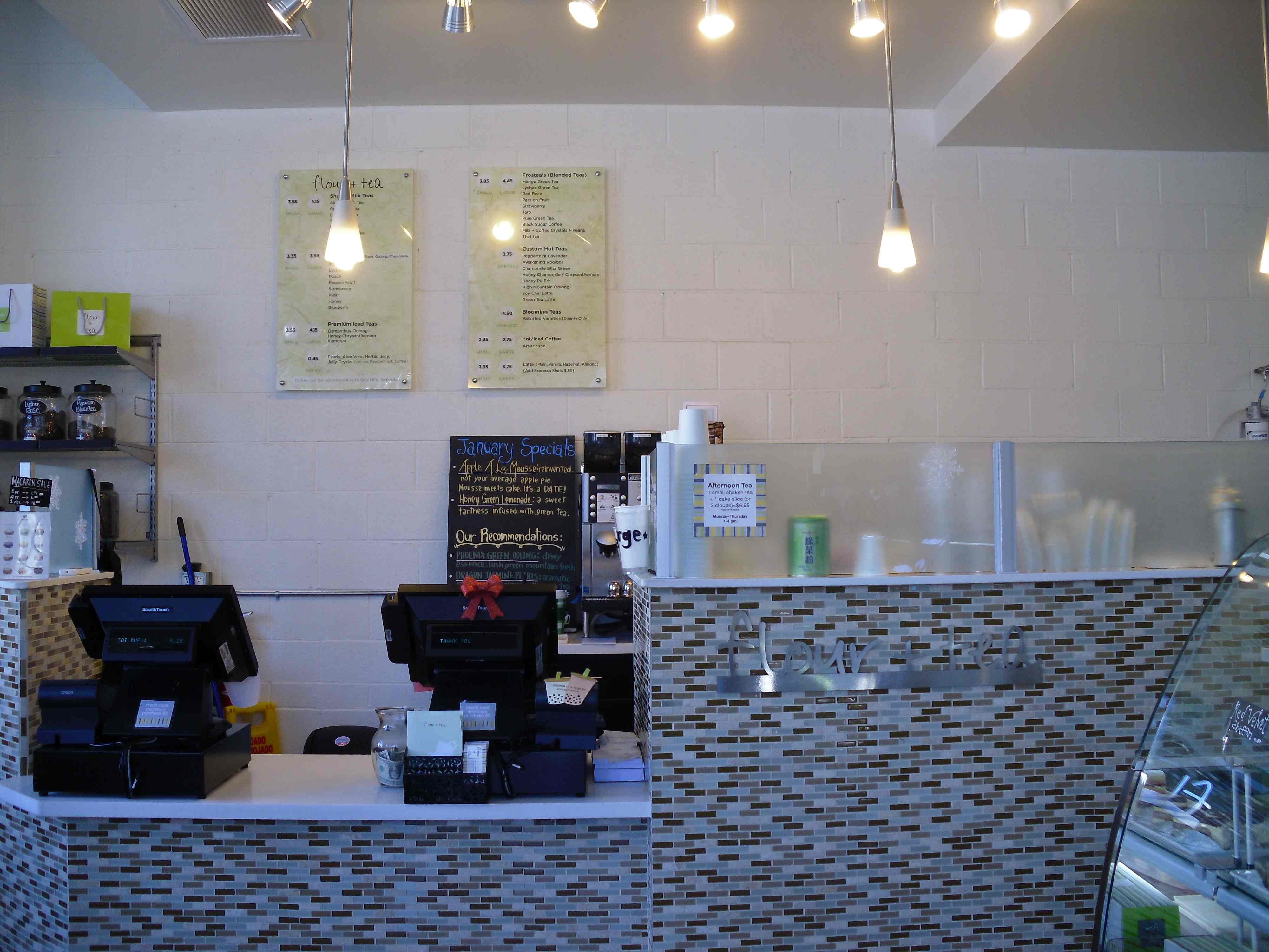 The teas here, known to be stronger than those at other teahouses, are freshly brewed every day. The refreshing white peach black iced tea and smoky black sugar shaken milk tea, sweetened or unsweetened to your liking, with or without pearls (tapioca/boba), hits the spot. A simplified selection of loose teas, including pu-erh (from the southeastern region of China) known for its cleansing, medicinal value, is available for sale. Loose tea prices range from $7.50 to $50 for a quarter pound, depending on the grade. Flour + Tea welcomes customers to place special orders as well.